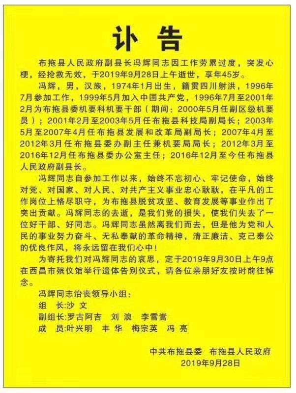 9月28日上午,四川省凉山州布拖县人民政府副县长冯辉同志因工作劳累过度突发心梗,经抢救无效逝世,年仅45岁。
